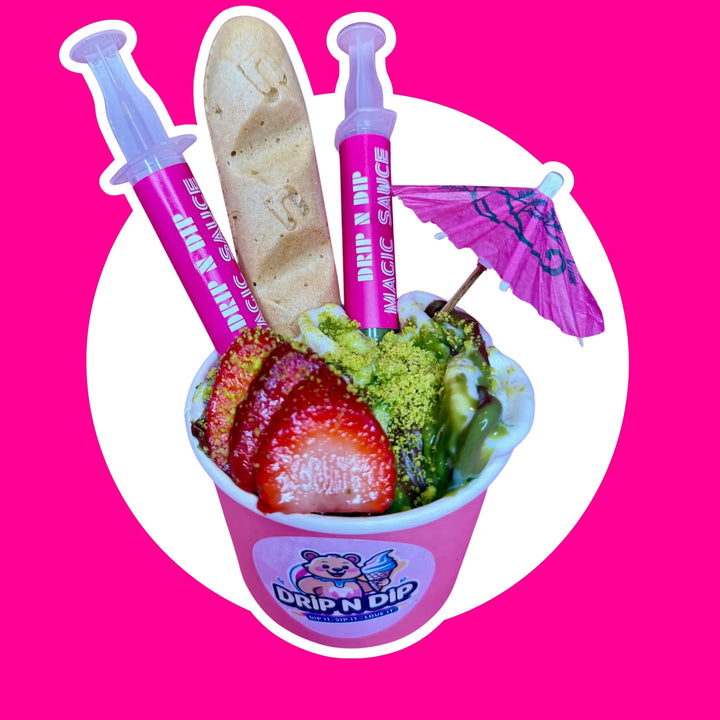 A luxurious swirl of vanilla-based ice cream rolls mixed with traditional Qatayef, crunchy pistachio crumbs, and a drizzle of our signature Drip n Dip Magic Sauce. Finished with layers of melted Belgian chocolate, fresh strawberries, an extra touch of Magic Sauce, and crowned with a Nutella chocolate bar — a true Dubai-inspired indulgence.
