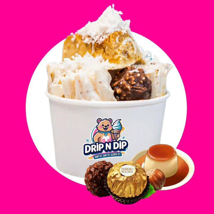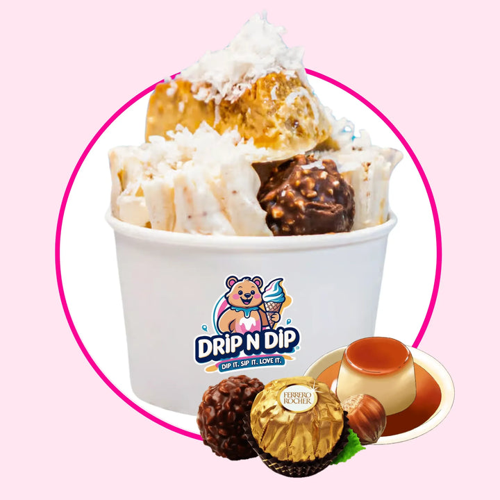 A dreamy dessert mashup! Flan-tastic Drip features silky vanilla ice cream rolled with creamy flan and two Ferrero bonbons inside. Topped with the remaining flan, a Ferrero crown, and a sprinkle of sweet coconut flakes — smooth, rich, and truly flan-tastic!